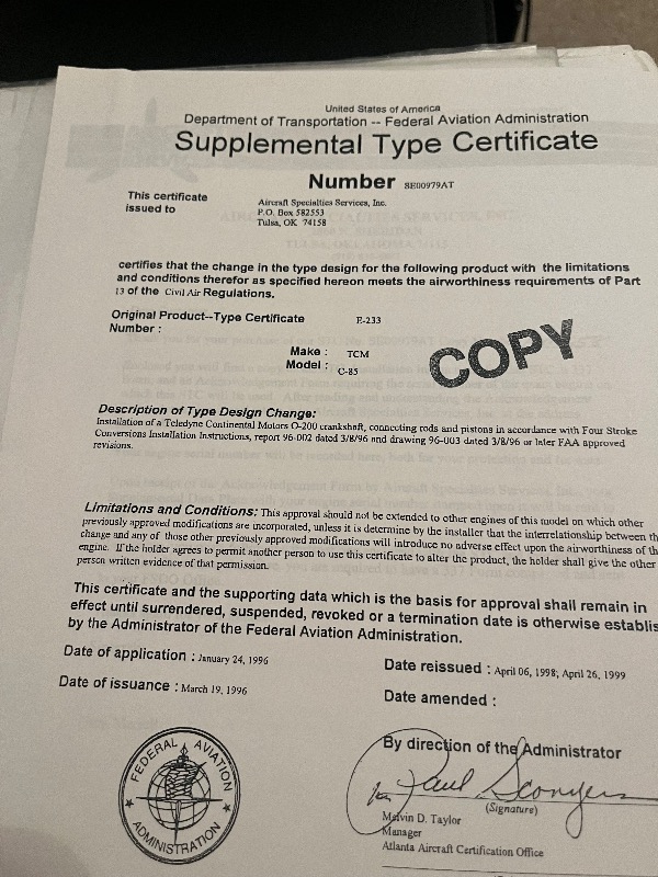 The coupe has a Flightline 760 com with intercom, no transponder. I did not install the O200 crank STC SE0979AT. The STC includes O200 crank, rods, pistons and bearings. The engine has an added data plate that addresses the STC. It has a Sensenich M76AK3-46 Prop.