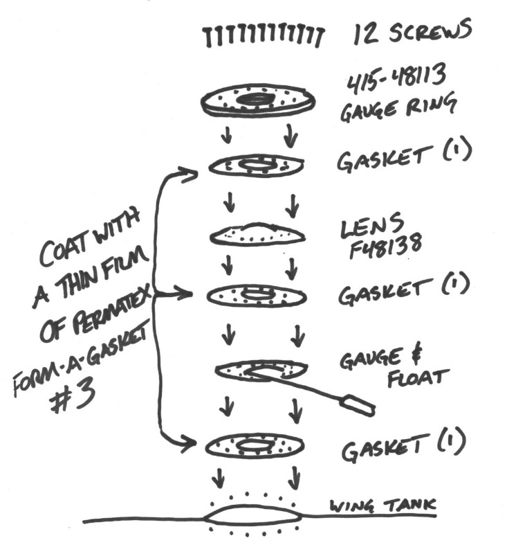 Third, get some Permatex Form-a-Gasket #3 , the non-hardening formula. You'll paint a very thin layer on each side of all three cork gaskets about 10 minutes before you're ready to reassemble the whole thing. My brand new installation was done "dry" and it would seep a bit of fuel around the edges. I tightened it as much as I dared to without improvement, so I took the whole thing apart again and reassembled with Permatex #3. It hasn't leaked a drop since then.