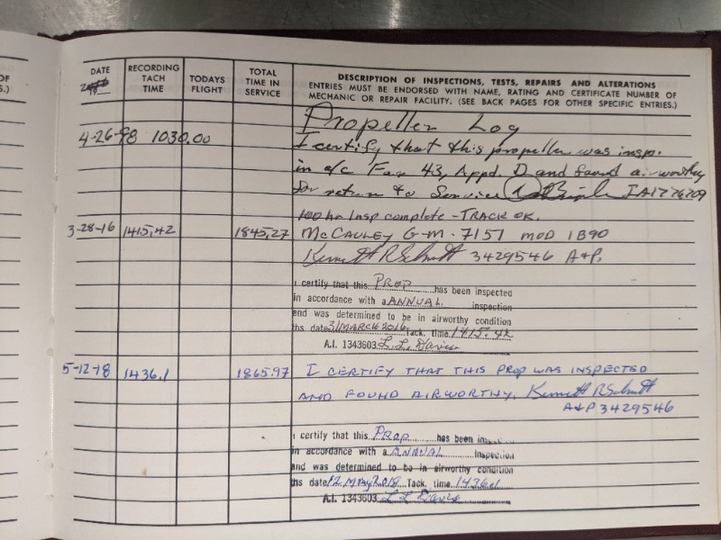 Thank You! I had forgotten about that with Part 91 flying. The only entries regarding the propeller are on the attached logbook page. I guess I am more concerned about corrosion than anything else. The HD pictures I have of it show it to be in excellent condition. I believe that this is the same propeller that was on the plane when it came off the production line. I do not have the SN, so I really have no way to tell at this moment. Thank you again for your assistance.