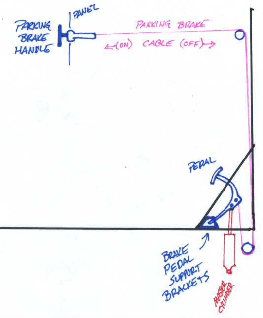 The parking brake handle pulls a cable that's routed back to a pulley at the top of the firewall. that top pulley turns the cable 90º down to the floor where another pulley turns it 180º up. The cable then immediately terminates at the middle of the brake pedal lever. So... when you pull the parking brake handle, you're pulling the brake pedal down and applying the brakes.