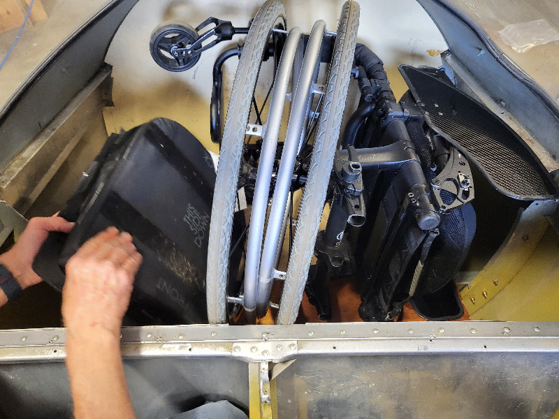 Went to go check in on the plane the other day (yes it's still undergoing maintenance and upgrades), and my A&P is currently finishing up the extended baggage STC. This whole thing was a bit of a calculated risk for me, but I was finally able to test whether or not my wheelchair would fit behind the seat, luckily it did! It takes some tetris-ing to get it in and out of there, but the important thing is it fits.
